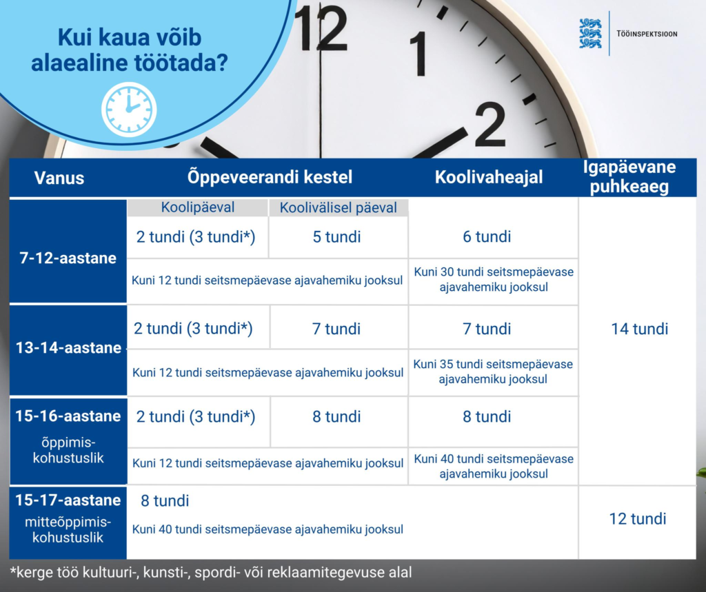 Kõige rohkem tekitab praktikas küsimusi just see, mitu tundi alaealine töötada tohib. Seepärast olemegi lisanud postituse juurde tabeli, kus on vanusegruppide kaupa välja toodud lubatud tööaeg:
